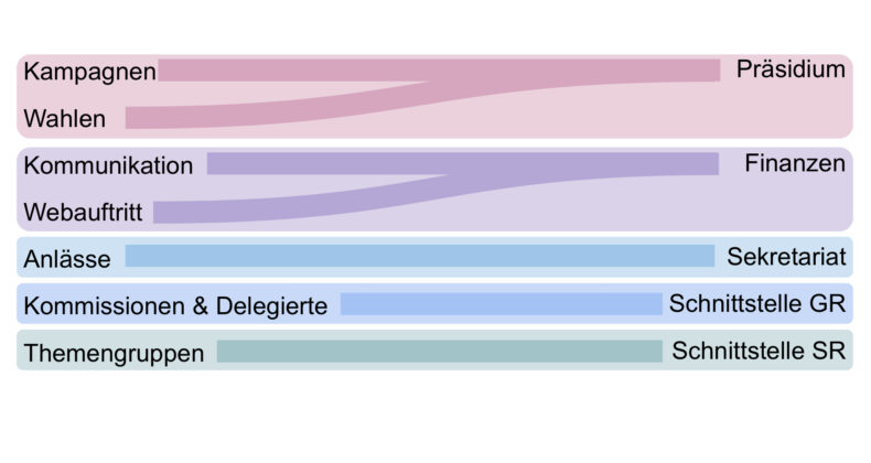Die Organisation der GRÜNEN Burgdorf sieht 12 Ressorts vor, die wie folgt besetzt sind: